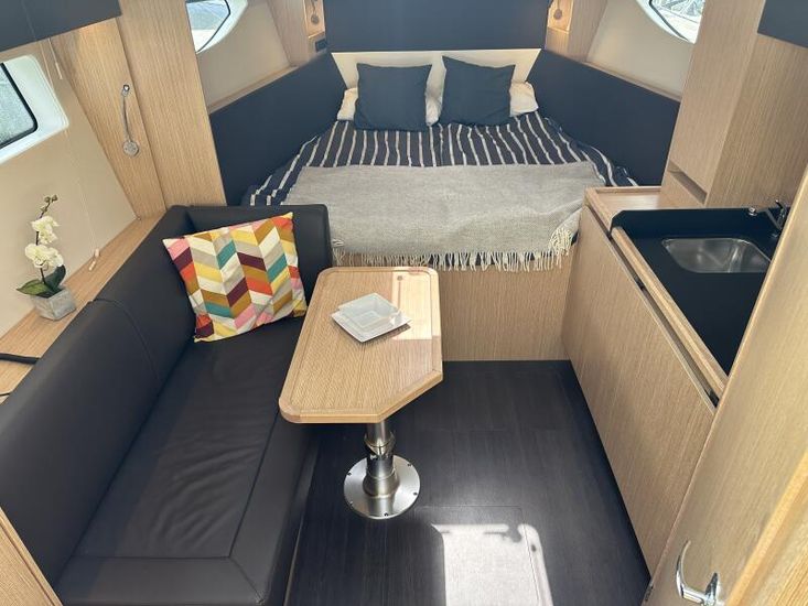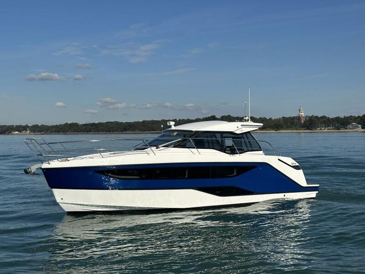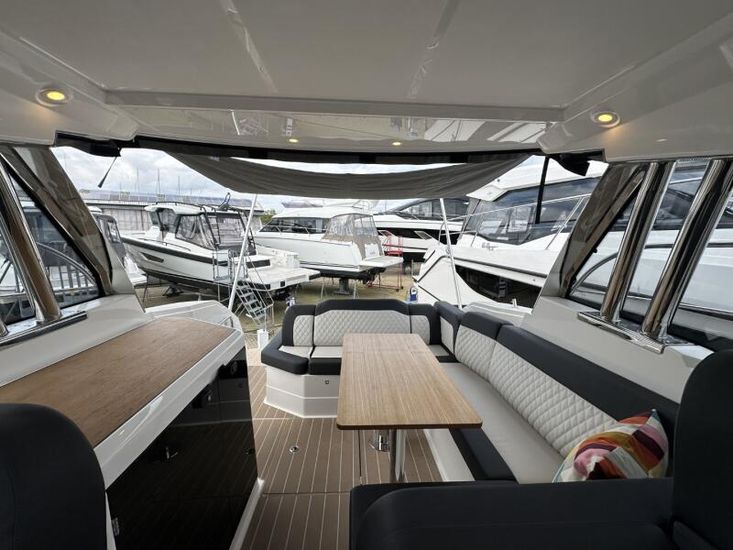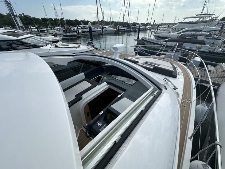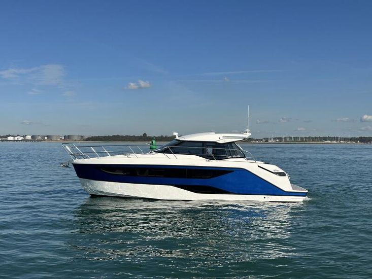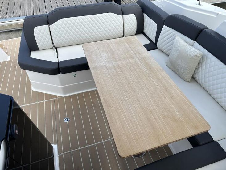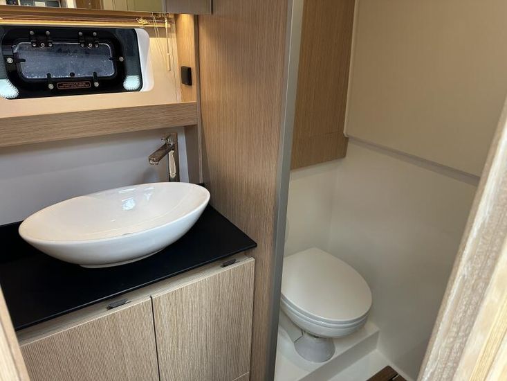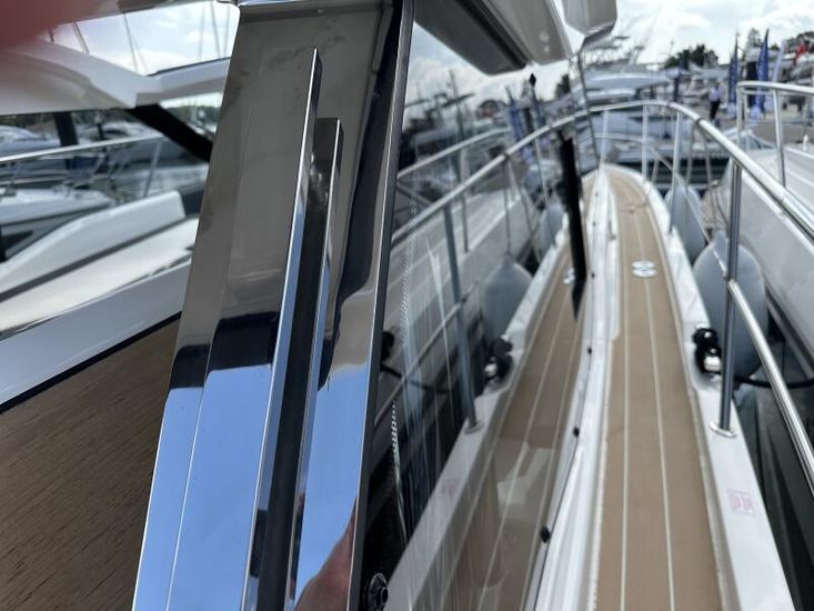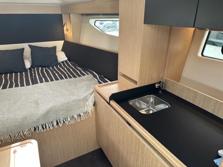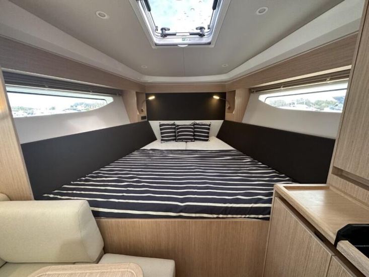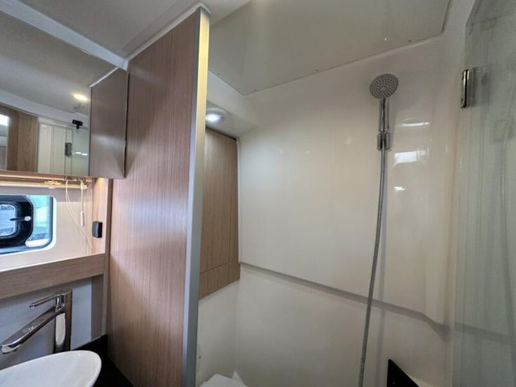 Aquamatic JoystickComfort Package, comprising;Refrigerator in cockpit wetbar (12v, 80L),Exterior light package (including underwater lights, step lights and lights around side decks),Luxury mattresses for all cabins,Electric toilet for heads compartment (fresh water flush),Foredeck sun cushions,Teak on cockpit floor,Teak on bathing platform,Interior light package,Venetian blinds for hull windows in saloon, forward cabin and aft cabinUpgrade to Comfort Package;Esthec on bathing platformEsthec on cockpit floorEntertainment Package, comprising;Fusion MS-RA770 Apollo marine radio with DAB+, 2 speakers in the saloon. Fusion ERX400 Apollo remote control with 2 speakers in the cockpitTV preparation in salon, digital and analog, inc antennaTrim tabs, electrically adjustableWater in fuel kitTunnel bow thruster (100 kgf), incl. service batteries,1 x 12 V / 140 Ah, AGMMultifunction display 2 x Simrad GO12 XSE 9" with integrated GoFree⢠Wi-Fi and bluetooth; all-weather touch screen on main helmstationSimrad RS40 VHF with inbuilt AIS Receiver + Simrad HS40 wireless handsetRemote control Simrad OP50 for multifunction displayAutopilot with heading compassMobile phone charger at helmSearch light with remote controlEsthec on side deckSun protection for front and side windows, outside, semi transparentElectric anchor windlass16kg Anchor with chain (50m, 8mm - stainless steel)Mooring kitSolid GRP electric sunroof (electrically operated)Footrest at helm with adjustable steering wheelStorage box for stern settee (not with table for stern settee)Cockpit upholstery "Silvertex" with Diamond StitchingCamper coverSun protection on aft deck (Bimini)Table in salon, manually lowerable with upholstery inc. one stool in upholstery colourInterior wood colour - White OakFloor - 'Wenge'Coloured fronts for upper cupboards in salon and galleyAdditional service batteryDiesel Generator 6.4kW max output 230vGrey water systemHot air heating 4.0kW for salon, forward cabin and aft cabinHot air heating 4.0kW for cockpit inc ventilation system for windscreenHull Wrap in Night Blue MetallicCommissioning including antifouling and fuel