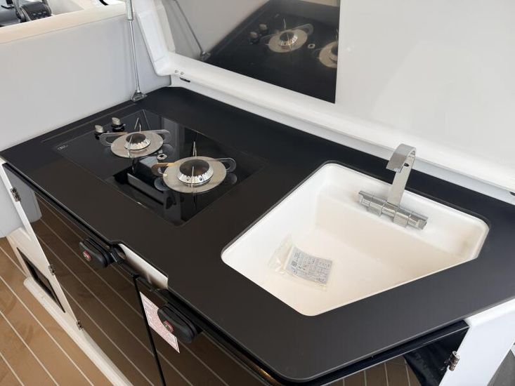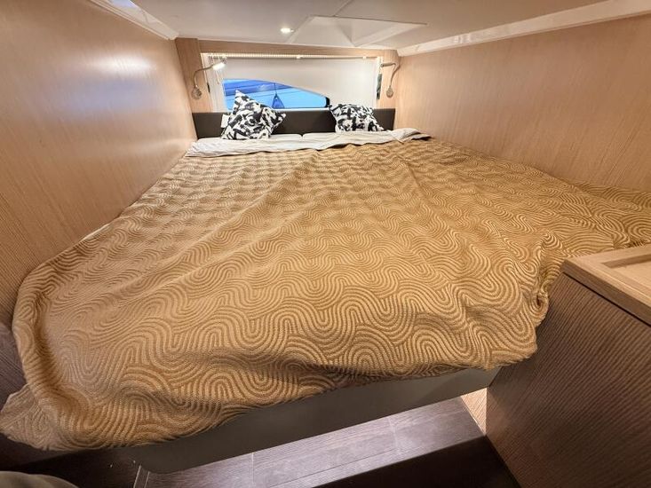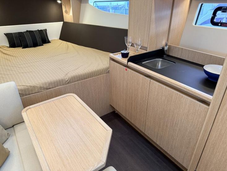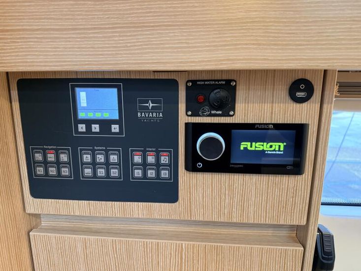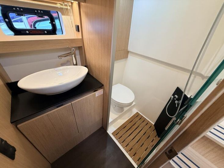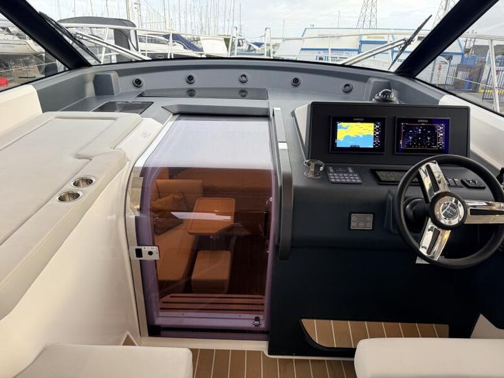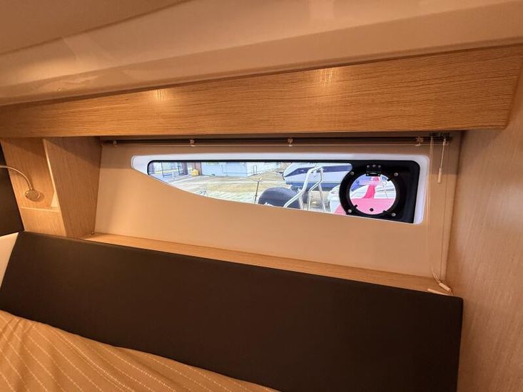 This vessel comes equipped withComfort PackRefrigerator in cockpit wet bar (12v 80L)Exterior light package including underwater lights, step lights and side deck lightingLuxury mattresses in all cabinsElectric sea toilet with freshwater flushForedeck sun cushionsEsthec cockpit floorInterior light packageVenetian blinds for hull windows in saloon, forward and aft cabins Entertainment PackFusion ERX400 Apollo marine DAB radio, 2 speakers in the saloon, 2 in the cockpit and helm remote controlEntertainment upgrade package, TV cabling and antenna (excluding screen)General specification and equipmentTrim tabs, electrically adjustableTunnel bow thruster and 140AH batteryMultifunction display, 2 x Simrad GO9 XSE 9" with integrated GoFree Wi-Fi and Bluetooth, all weather touchscreen at helm.Simrad RS40 VHF with AIS receiver and Simrad HS40 wireless handsetMobile phone charger at helmElectric anchor windlass16kg anchor with 50m chainSolid GRP electric sunroofAdjustable steering wheelCockpit table at stern settee, lowers to make sunbedRear sunbed upholsteryCockpit BBQCockpit upholstery "Stone"Saloon table, lowers to make double berthHigh quality galley worktop in "Crispy milk" finishInterior upholstery in "Comfort cream"2nd domestic batteryCamper coverFull commissioning and antifouling